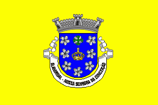 Shield Azure, a Marian crown Or, surrounded in orle by eight oleander blossoms Argent, the blossom in central chief is charged with a cross fleury Vert. Mural crown Argent with three visible towers (village rank) and white scroll with inscription in black capitals "ALANDROAL - NOSSA SENHORA DA CONCEIÇÃO".
