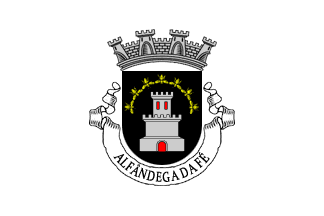 The coat of arms is Sable a towered Argent ((masoned Sable)) with port and windows Gules, surrounded in chief by an arch of seven bees Or pointing to the centre. Mural crown Argent with four visible towers (town rank) and white scroll reading in black upper case letters "VILA DE ALFÂNDEGA DA FÉ" (see right image above).