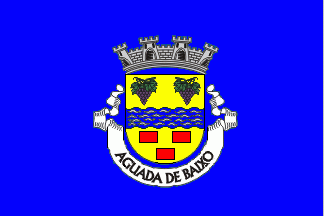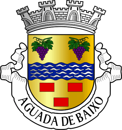 Shield Or, a fess wavy Azure semy of wavelets Argent, in chief two grapevines Purpure leaved Vert in fess, in base three billets Gules ordered 2:1. Mural crown Argent with four visible towers (town rank) and white scroll with inscription in black initials "AGUADA DE BAIXO".