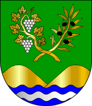 Shield Or with base wavy Azure and Argent barruly wavy an eradicated grapevine Vert fruited Purpure, in chief two olive twigs Vert fruited Sable in saltire. Mural crown Argent with three visible towers (village rank) and white scroll reading in black upper case serifed letters "VALE DE MENDIZ".