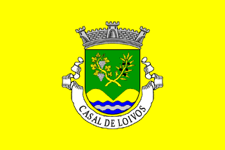 Shield Vert with base wavy Azure charged with a barrulet wavy Argent a branch of vine Or fruited Argent and a branch of olive Or fruited Sable in saltire, issuant from a doublemount Or. (village rank) and white scroll reading in black upper case serifed letters "CASAL DE LOIVOS".