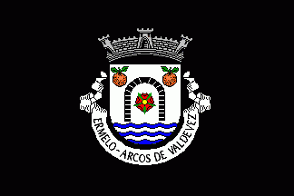 Shield Argent with base wavy of Azure and Argent, on fess point a heraldic rose Gules seeded Or and barbed Vert, surrounded by an impending full arch Sable masoned Argent, on either chief corner an orange proper leafed Vert. Mural crown Argent with three visible towers (village rank) and white scroll reading in black upper case serifed letters "ERMELO - ARCOS DE VALDEVEZ".