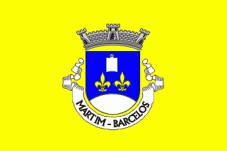 Shield Azure, two fleur-de-lis Or set in fess, issuant from base a mount Argent, in chief a mattock's blade Argent. Mural crown Argent with three visible towers (village rank) and white scroll with inscription in black capitals "MARTIM - BARCELOS".