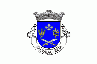 Shield Azure, a sheaf of three wheat ears Or at dexter and a branch of olive Or fruited Sable at sinister between a fleur-de-lis Argent in chief and a sword over a scimitar, both Argent hilted Or and crossed per saltire. Mural crown Argent with three visible towers (village rank) and white scroll with inscription in black initials: "SALVADA - BEJA".