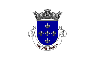 Azure field, 5 argent fleur-de-lis, displayed in cross. Argent 3 towers mural crown. White scroll with "ADAÚFE - BRAGA" in upper case black letters.