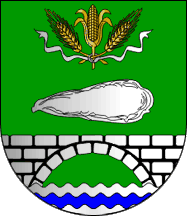Shield Or a weaver´s shuttle Gules in fess with yarns Argent, on chief a corn cob Gules leafed Vert between two rye ears Vert, all tied Gules,
