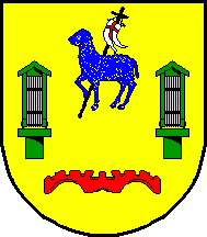 Shield Or two granaries Vert with lattice Or in fess, flanked on chief bay a Paschal Lamb Azure and on base by a yoke Gules.