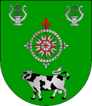 Shield Vert a compass rose Argent garnished and main pointed Gules between two lyres Argent stringed Sable in canton, in base a milk cow passant Argent spotted Sable. Mural crown Argent with three visible towers (village rank) and white scroll reading in black upper case letters "NORTE PEQUENO".