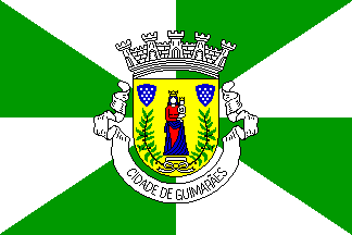 The arms are or, the Virgin Mary holding Jesus proper, both crowned or (no nimbus), above a wreath of olive bounded argent, and between two inescutcheons in chief, azure, eleven bezants argent placed 3+2+3+2+1 (“quina” — the ineschutcheons are like those found on the Portuguese royal arms of 1185-1211, a period during which, Guimarães Castle was the usual residence of the Kings of Portugal). Mural crown argent with five visible towers (city rank) and white scroll reading in black upper case letters "CIDADE DE GUIMARÃES".