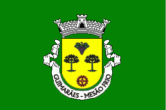 Shield Or, two eradicated pines Vert set in fess, in chief a grapevine Purpure leaved Vert, in base a cogwheel Gules. Mural crown Argent with three visible towers (village rank) and white scroll with inscription in black capitals "MESÃO FRIO - GUIMARÃES".