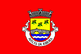 Shield Or with base wavy of Azure and Argent, issuant from base wavy a bridge Sable masoned Argent with two arches, on chief three hazelnut twigs Vert fruited Gules ordered 2:1. Mural crown Argent with three visible towers (village rank) and white scroll reading in black upper case serifed letters "AVELÃS DA RIBEIRA".