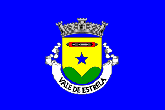 The arms are Or a 5-point star Azure and in chief a shuttle Gules open Sable and threaded Argent and two coupaux Vert issuant from the base. Mural crown argent with three visible towers (commune rank) and white scroll reading in black upper case letters "VALE DE ESTRELA"