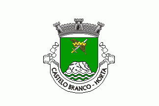 Shield Vert with base wavy of Argent and Vert, issuant from base a cape (promontory) Argent; in chief an ancient coronet Or, surrounding a sword Argent hilted Or and a palm frond Or, crossed per saltire. Mural crown Argent with three visible towers (village rank) and white scroll with inscription in black capitals "CASTELO BRANCO - HORTA".