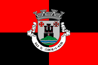 On a silver field, realized as light grey (left image above) or white (left image above), a black castle over a green hill charged with silver-blue silver waves, in dexterer chief a “templar” cross,in sinister chief an Order of Christ cross, 4 silver tower mural crown and a white scroll with the words in black "VILA DE IDANHA-A-NOVA".