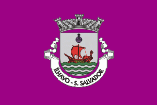 The shield is Argent, a sailing ship Gules with oars and rudder Or sailing to the dexter over waves Vert and Azure., in central chief an orb purple. Mural crown Argent with three visible towers and white scroll reading in black upper case letters "ÍÍLHAVO - S. SALVADOR".