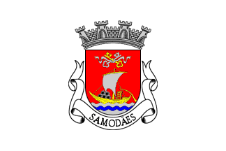 Shield Gules a local rabelo sailship Or with its sail Argent, loaded with casks Sable, issuant from base wavy Argent ,charged with a barrulet wavy Azure, on chief two keys crossed saltirewise with one Or bendwise over the or Argent and the pair ties with a ribbon Argent. Mural crown Argent with four visible towers (village rank) and short white scroll, in Bénard Guedes style, reading in black upper case serifed letters "SAMODÃES".