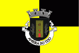 Shield Sable, an embattled tower Or masoned Sable with port and windows Gules, flanked by two paly olive branches Argent fruited Or. Mural crown Argent with four visible towers (town rank) and white scroll with inscription in black initials "AMIEIRA DO TEJO".