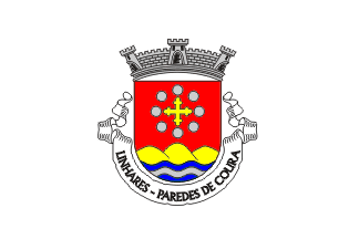 The arms are Gules a cross bottony Or surrounded by eight plates and issant from a base wavy azure charged with a barrulet wavy Argent a triple mount Or. Mural crown argent with three visible towers (village rank) and white scroll reading in black upper case letters "LINHARES - PAREDES DE COURA".