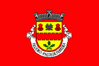 Shield Or, a fess dovetailed counter dovetailed Gules; in chief a grapevine Purpure leafed Vert, flanked by two scallops Gules; in base an oak twig Vert, having three leaves and two acorns. Mural crown Argent with three visible towers (village rank) and white scroll with inscription in black capitals "FIGUEIRÓ - PAÇOS DE FERREIRA".