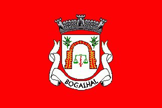 Shield Argent, an arch Gules masoned Or, flanked in chief by two olive branches vert fruited Sable, beneath the arch a pair of scales Vert, balanced by a sword flamant Gules in pale. Mural crown Argent with three visible towers (village rank) and short white scroll, in Bénard Guedes style, with inscription in black capitals "BOGALHAL".
