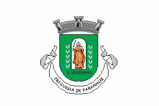 Shield Vert, in an arch Argent a saint dressed tawny and holding a palm leaf in his right hand, the arch is flanked by ten pairs of laurel(?) leaves ordered twice per pale, beneath the arch is a black inscription "S. VERÍSSIMO". Mural crown Argent with three visible towers (village rank) and white scroll with inscription in black initials "FREGUESIA DE PARANHOS".