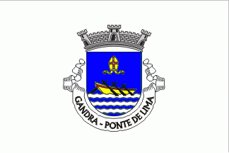 Coat of Arms: Shield Azure, a rowing boat Or garnished Gules with three pairs of skulls Sable, crossing a base wavy of Argent and Azure, in central chief a mitre Or garnished Gules. Mural crown Argent with three visible towers (village rank) and white scroll with inscription in black initials: "GANDRA - PONTE DE LIMA".