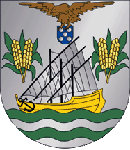 Shield Argent, over a base wavy Vert and Argent a caravel Or ornamented, roped, masted and anchored Sable, rigged Argent between two corn cobs Or leaved Vert, in chief a goshawk Proper holding an inescutcheon Azure charged with five plates set in saltire. Mural crown Argent with four visible towers (town rank) and white scroll reading in black upper case letters "POVOAÇÃO".