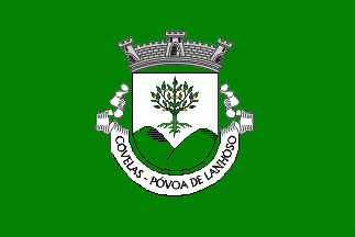 Shield Argent, issuant from base a doublemount Vert, in chief an impending, eradicated oak Vert, fruited Or. Mural crown Argent with three visible towers (village rank) and white scroll with inscription in black capitals "COVELAS - PÓVOA DE LANHOSO"