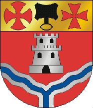 The coat of arms is Gules, a castle tower Argent above a chevronel wavy inverted Azure fimbriated Argent, chief Or a frying pan Sable, between two templar crosses: dexter the “round” one, usual in Portugal, and sinister, the older one, similar to Malta’s. The scroll is unusal for it reads in two lines instead of one: "SARTAGO STERNIT SARTAGINE HOSTES / VILA DA SERTÃ".