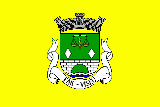 Shield Vert, issuant from base wavy of Argent and Azure a throughout bridge Argent masoned Sable, above two lozenges Argent in fess, on central chief a pair of scales Or balanced by a sword flamant of the same. Mural crown Argent with three visible towers (village rank) and short white scroll, in Bénard Guedes style, reading in black upper case serifed letters "FAIL – VISEU".