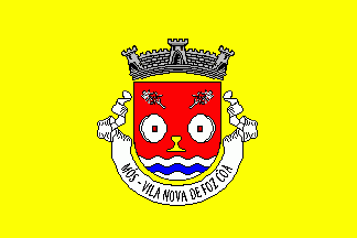 Shield Vert with base wavy of Argent and Azure, issuant from base wavy a bend sinister Argent charged with a bendlet sinister Azure, on dexter chief point an almond tree Or eradicated of the same with crown filled with blossoms of Argent and Gules, on sinister fess point a mill wheel Argent. Mural crown Argent with four visible towers (town rank) and white scroll reading in black upper case serifed letters "FREGUESIA DE VILA NOVA DE FOZ CÔA".