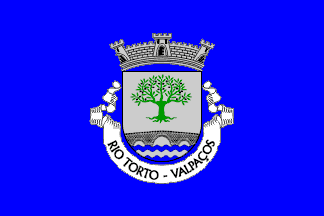 Shield Argent, an eradicated olive tree Vert fruited Sable, issuant from base wavy Azure, charged with a barrulet wavy, Argent a three-arched bridge Sable masoned Argent. Mural crown Argent with three visible towers and white scroll reading in black upper case letters "RIO TORTO - VALPAÇOS".