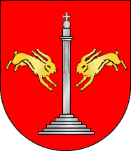 The shield of the arms is Gules a pillory Argent between two hares respectant Or. Mural crown Argent with four visible towers (town rank) and white scroll reading in black upper case letters "PAÇÓ - VINHAIS".