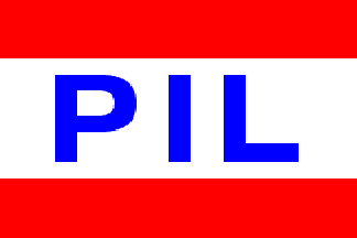 Flag horizontally divided red-white-red (1:2:1) with PIL in blue in the white stripe. Source: Joseph Nüsse's website.