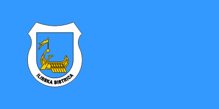 There is also a table flag in use, with the coat of arms surmounted by the white writing "OBČINA / ILIRSKA / BISTRICA".