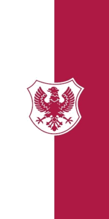 The coat of arms of theCity of Kranj has the shape of an early Renaissance shield with a shallow side cut on both sides, a silver field and an eagle with outstretched wings and a head turned to the right. The basis for the eagle figure, dimensional proportions, shield shape and color combination is the historical coat of arms from the seal from 1530. The eagle is a burgundy-red cinnabar. Subject to heraldic rules, the silver-metallic color of the shield in print is replaced by white. Regardless of the placement or display of the flag, the eagle is always upside down. The flag consists of a white and cinnabar burgundy-red field.