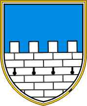 The coat of arms of Tržič is "Azure, masoned walls argent with four embattlements".