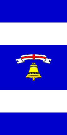The flag is rectangular, in proportions 2:5, blue with two vertical stripes of white, the middle blue field being a square containing the bell and the St. George's ribbon from the coat of arms.