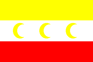 The flag is horizontally divided yellow-white-red, with three yellow crescents placed horizontally in the white stripe.