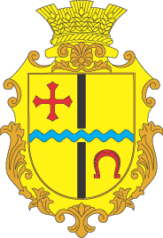"Or; azure wavy fess and sable narrow pale, fracted in the center. In the dexter chief is gules cross, in the sinister base is gules horseshoe. The shield enframed by or cartouche and crowned by or village crown. The author is E.Chernets'kyi.
