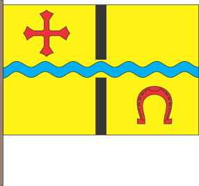 "The yellow rectangular panel with a ratio of the sides as 2:3 are divided on four fields by horizontal wavy and vertical black strips; the black strip is interrupted in the middle; in top staff field is red cossack cross; in the bottom free field is red horseshoe."