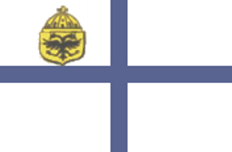 Ensign: Rectangle 2:3. White field. Blue St. George's Cross. Yellow shield with double-headed eagle in upper hoist.