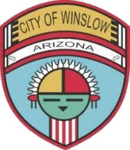 The flag of the city of Winslow, Arizona, shows the city shield on it. The shield consists of three parts - "CITY OF WINSLOW" on the top, "ARIZONA" in the middle, and an (I suppose) Indian mask on the bottom. Information, photo of the flag and image of the shield by Suzy Wetzel, CMC, City Clerk City of Winslow.