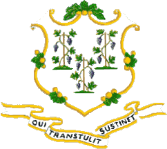 The Connecticut coat of arms is defined by § 3-105 of Connecticut General Statutes as follows: "A shield of rococo design of white field, having in the center three grape vines, supported and bearing fruit. The vine located in the center of the shield and the vine located on the right side of the shield shall ascend in a counterclockwise manner. The vine located on the left side of the shield shall ascend in a clockwise manner. The bordure to the shield shall consist of two bands bordered by fine lines adorned with clusters of white oak leaves (Quercus alba) bearing acorns. Below the shield shall be a white streamer, cleft at each end, bordered with two fine lines, and upon the streamer shall be in block letters the motto 'QUI TRANSTULIT SUSTINET.'"
