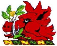 The state military crest, which is the crest used in the coats of arms of units of the National Guard, as granted by the precursor organizations of what is now the Army Institute of Heraldry. The official Institute of Heraldry blazon is "A boar's head erased gules, in the mouth an oak branch vert fructed or. [This is based on the arms of the founder of the colony of Georgia, James Oglethorpe.]"
