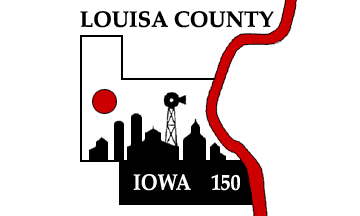 Archived copies of the pages about Louisa County are still at web.archive.org/web/*/www.iowacounties.org/County+Info/History+Pages/louisa.htm and web.archive.org/web/*/www.iowacounties.org/County+Info/Flags/Louisa.htm. It is a ~3:5 plain white (?) flag with a large emblem centered on it. The emblem is a stylized county map outlined in thick line segments and showing in solid (black?) the course of the Mississippi River (its eastern / flywise boundary) extending to the top and bottom edges of the flag. The map is filled with a solid skyline showing farm and town buildings incl. a water pump under a sun disc at the hoist side; on its foreground area lettering reading "Iowa 150" in white (?), while in black there's the lettering "Louisa County" between the top edge of the flag and the northern boundary line - both set in serif (Palatino typeface) capitals.