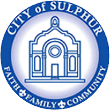 A blue flag, the outline of a state building in the center, CITY OF SULPHUR arched over it in white, and FAITH + FAMILY + COMMUNITY written below.