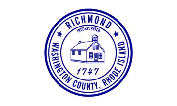 The flag of the town of Richmond, Rhode Island, features the town seal in dark blue centered on a white field. The town seal is white with the outline of a single-story house in the center. Above the house is arched the word "INCORPORATED" while below the house is the date "1747." In the ring that borders the circular seal are the words "RICHMOND" and "WASHINGTON COUNTY, RHODE ISLAND".