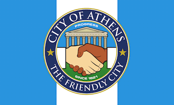 The flag is a vertical triband blue-white-blue with the seal in the center overlapping on to the blue stripes.