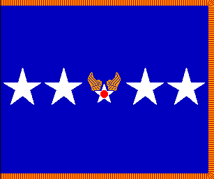 Color, Commanding General, U.S. Army Air Forces: Five general officers of the Army were authorized silk colors--the General of the Armies (Pershing), the Chief of Staff, the CG Army Ground Forces, the CG Army Service Forces and the CG Army Air Forces. For the latter, the field of the color was ultramarine blue. The shoulder sleeve insignia (SSI) for Army Air Forces was centered on the color, but with its ultramarine blue disk invisible against the field of the flag. On either side of the insignia were two white stars to denote the CG's four-star rank. The CG, USAAAF was General H.H. "Hap" Arnold. Dimensions for this flag were 4 feet 4 inches at the hoist by 5 feet 6 inches on the fly.